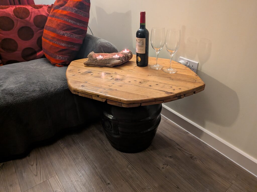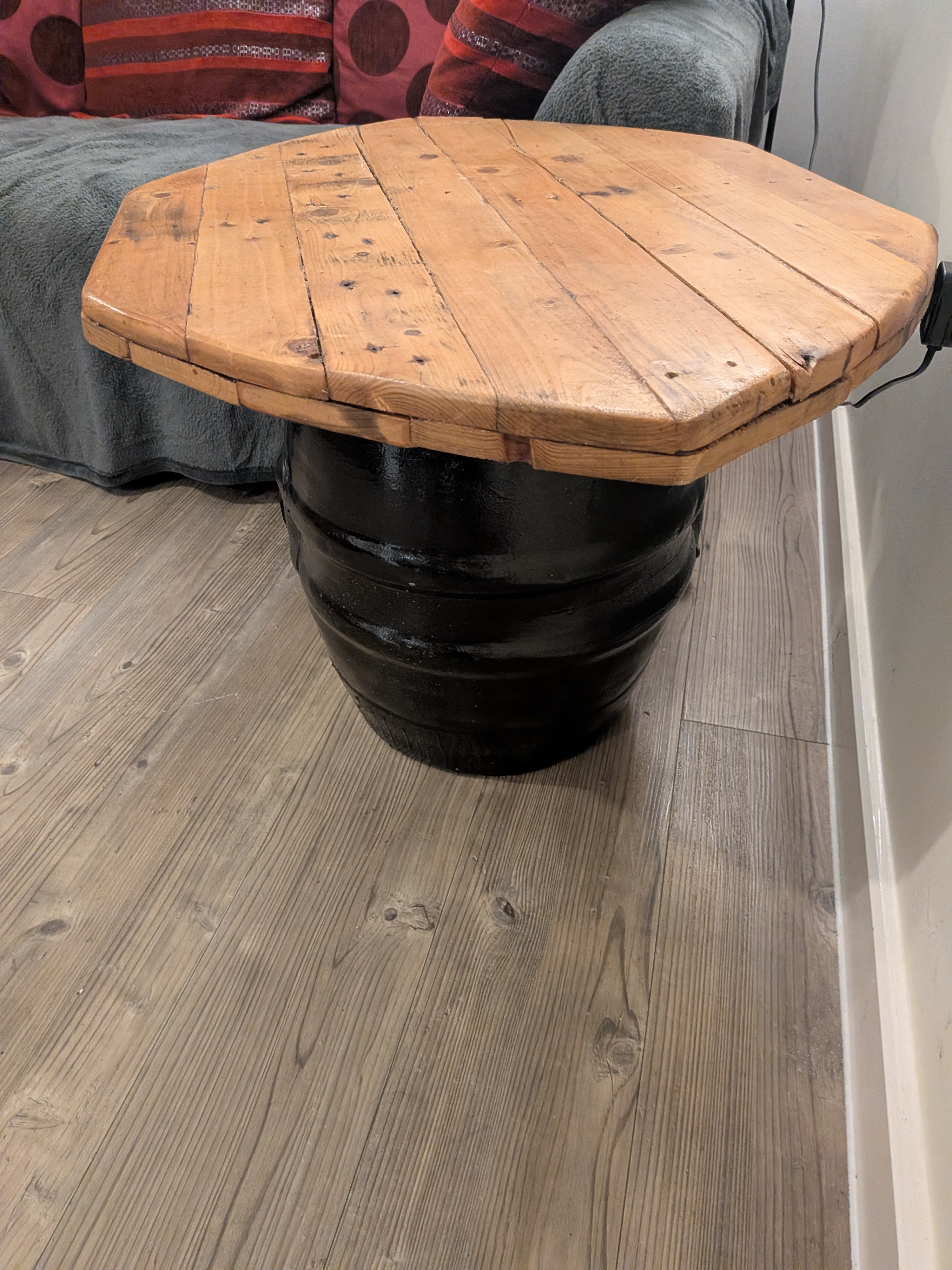 Wih this coffee table, I used one of my beer barrels and painted it black, but went into the back of my shed to find a very old experiment for the table top.