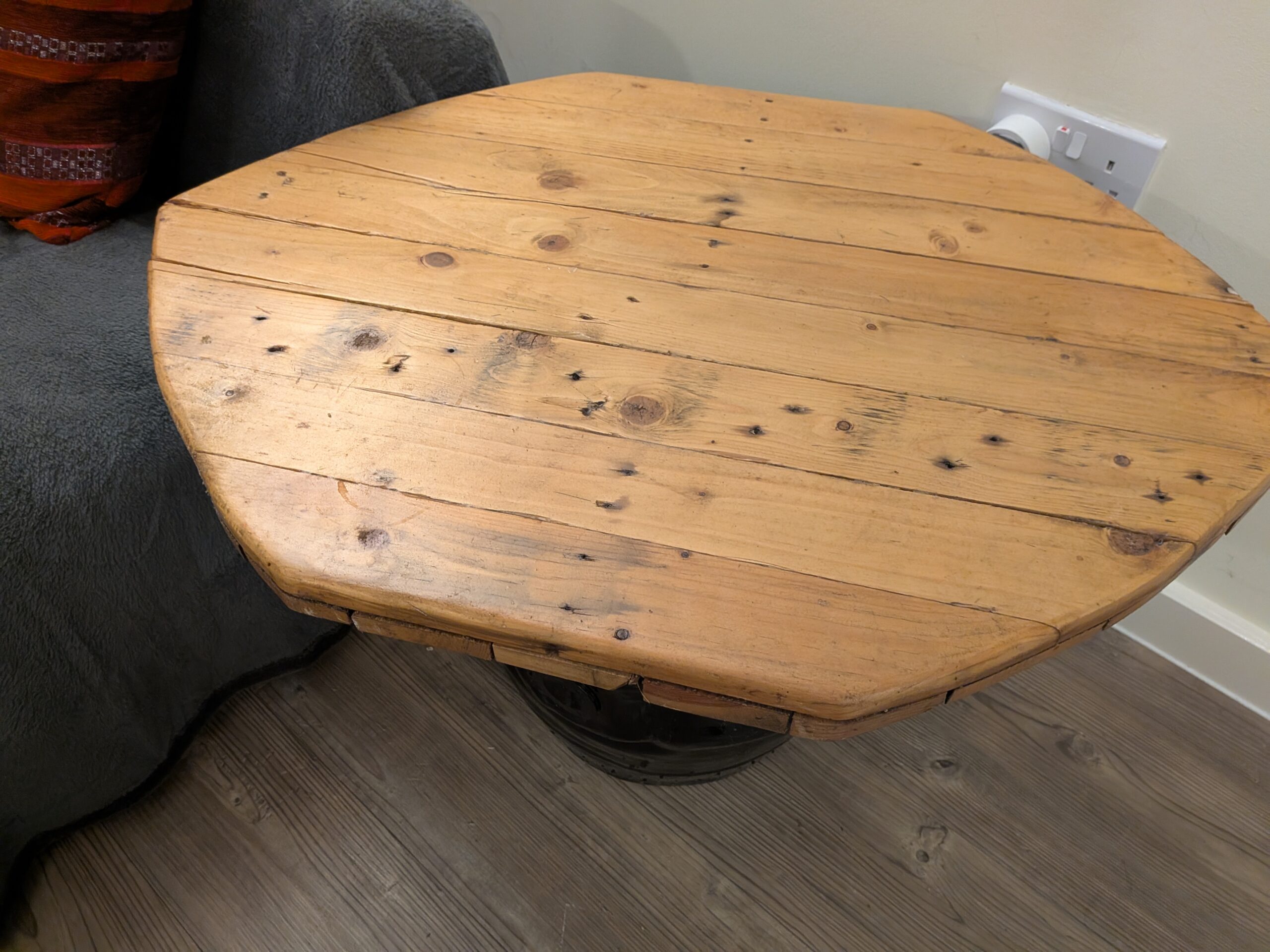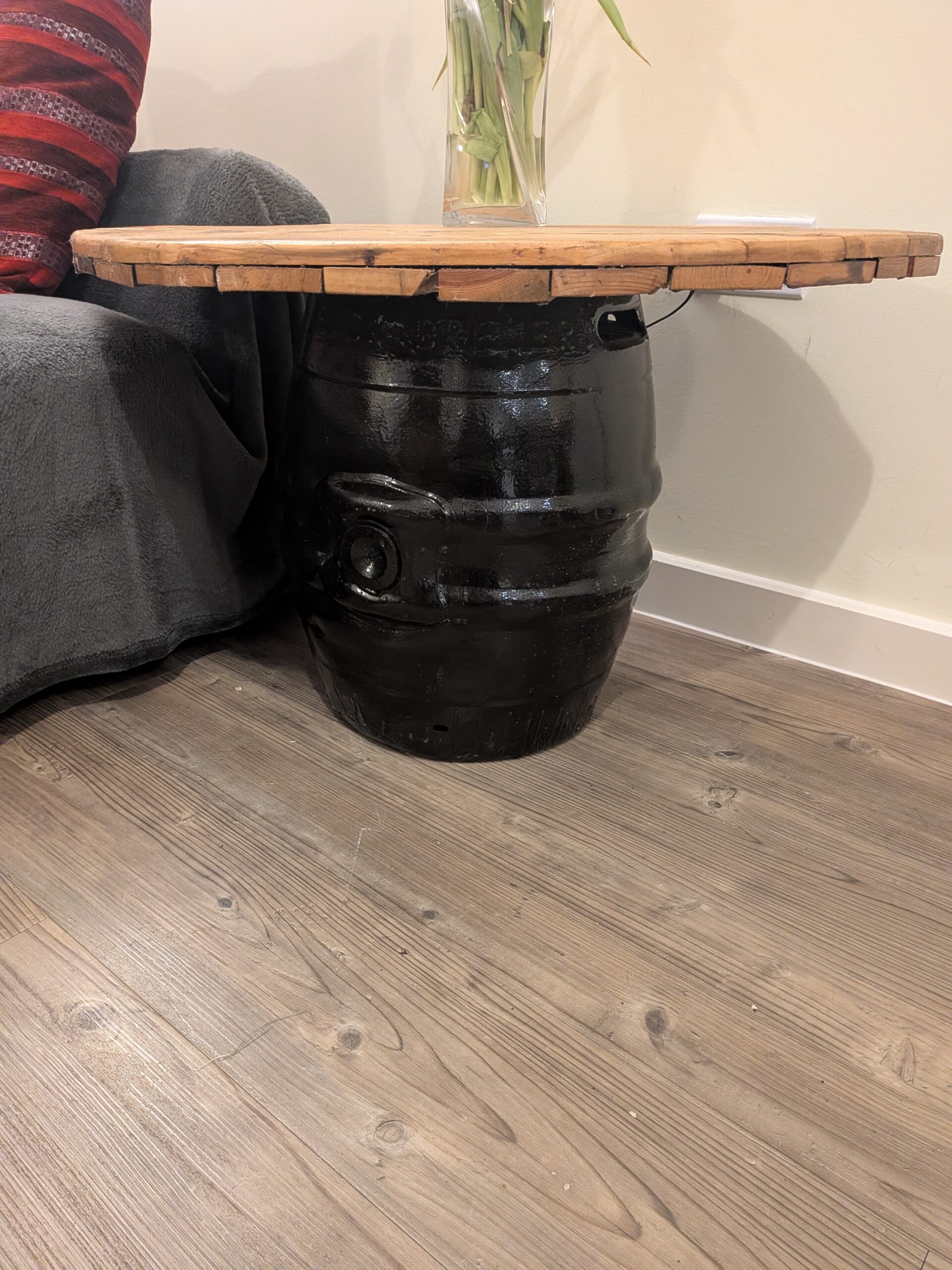 Wih this coffee table, I used one of my beer barrels and painted it black, but went into the back of my shed to find a very old experiment for the table top.