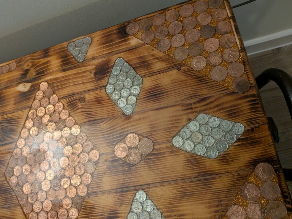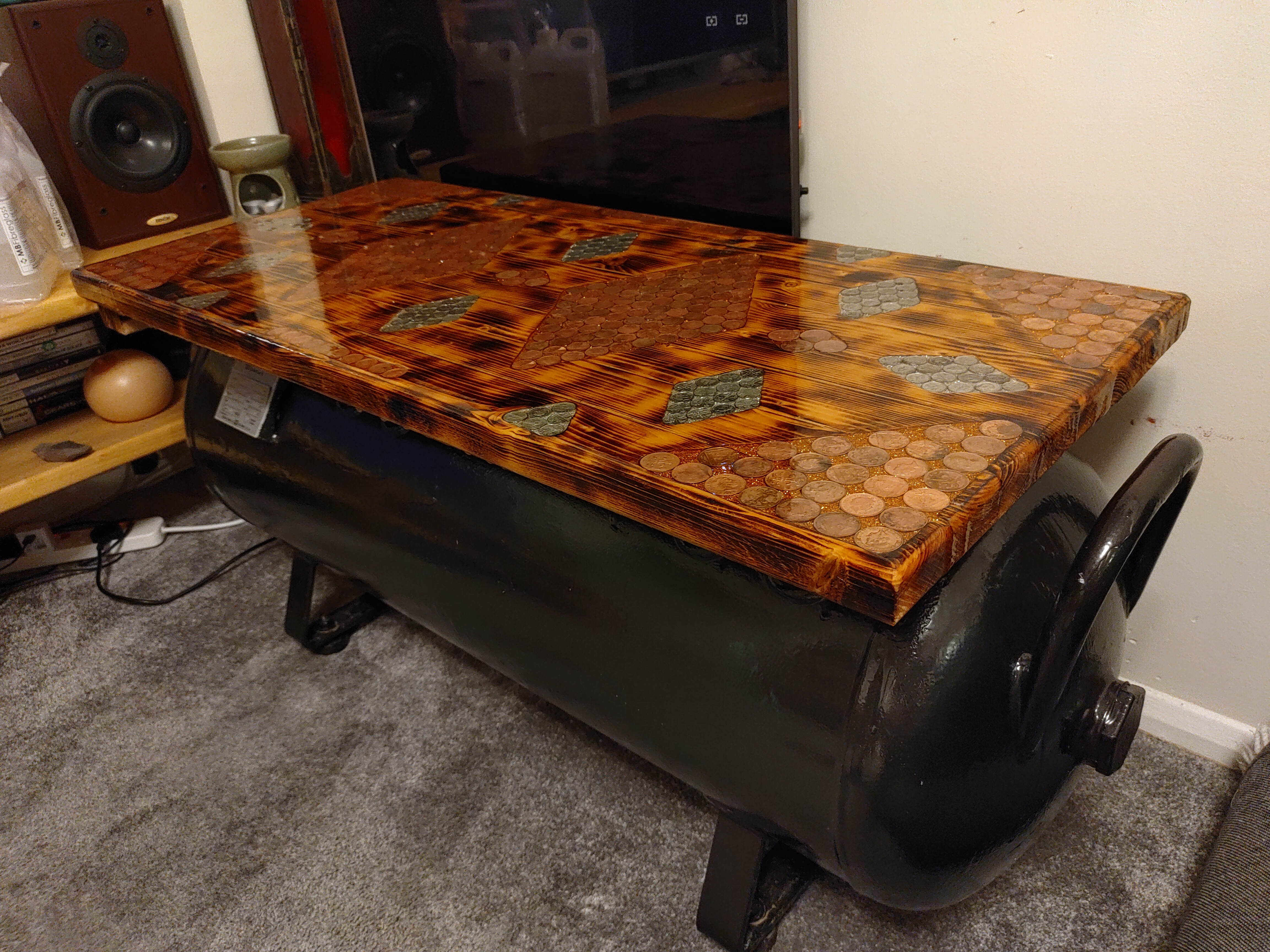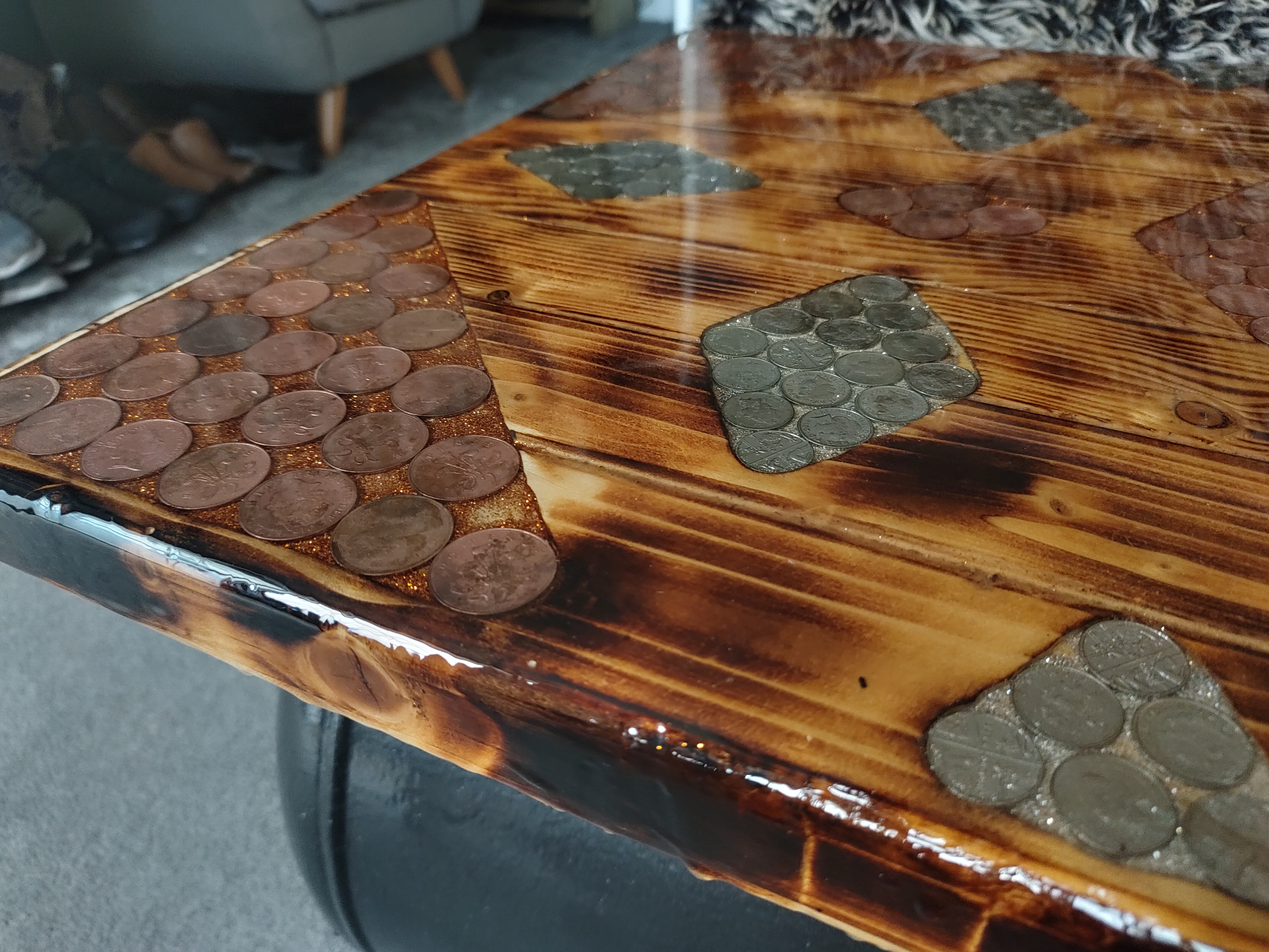 150L steel receiver tank, with 8 peices of burnt wood joined to make a surface. The coins are submerged into the face with some copper/silver glitter behind them, then covered with epoxy resin