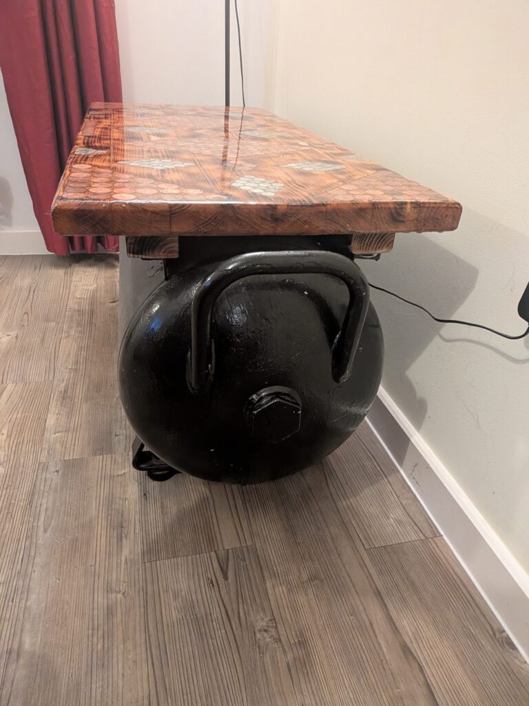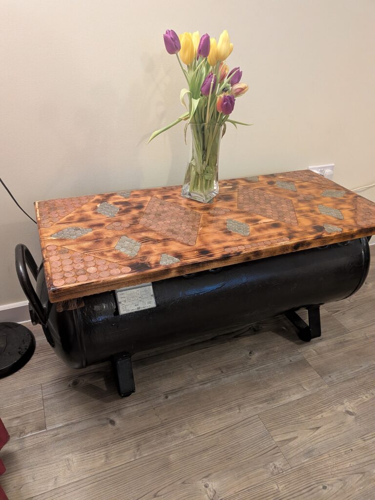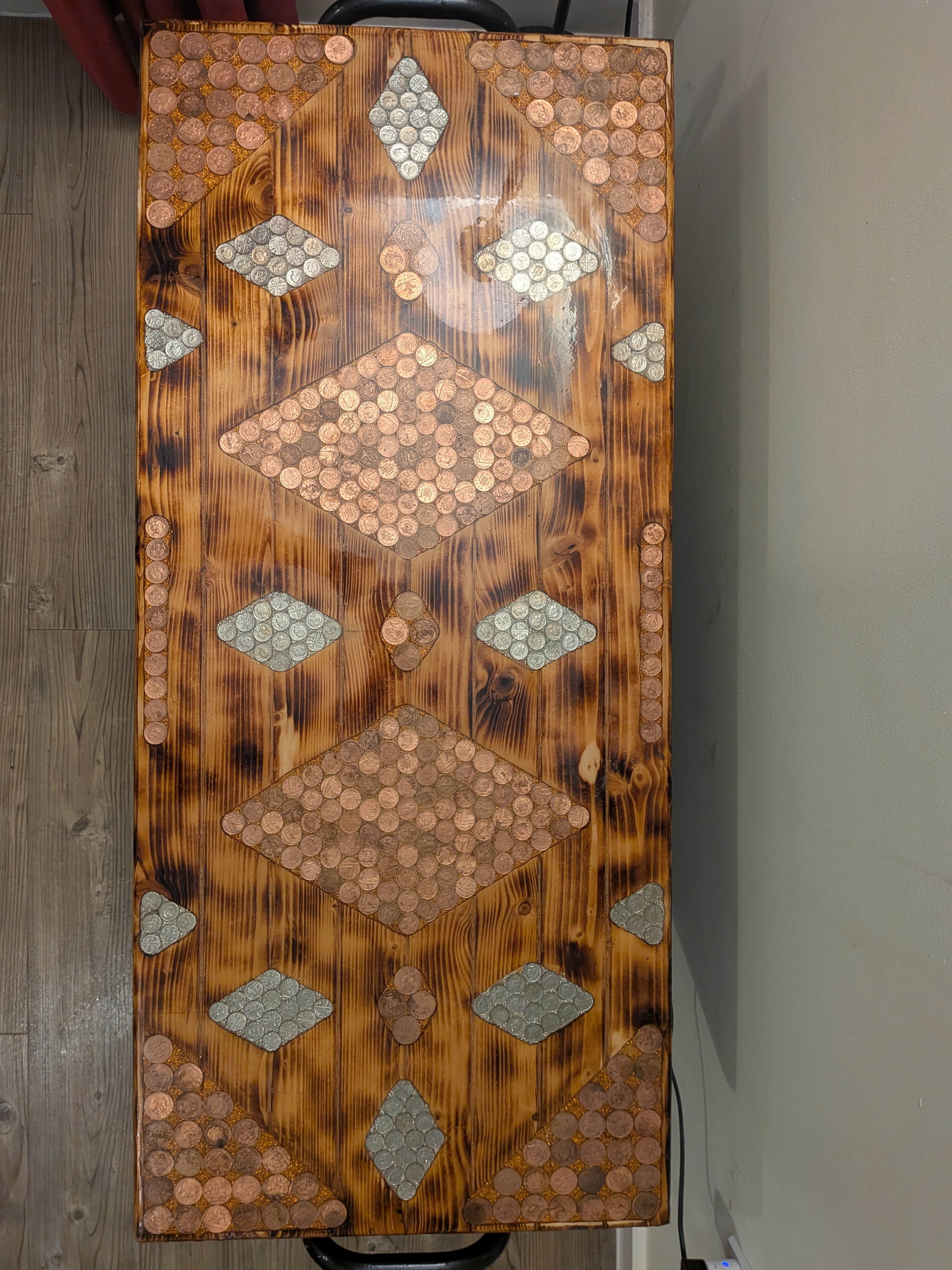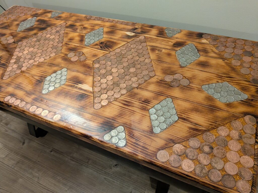 150L steel receiver tank, with 8 peices of burnt wood joined to make a surface. The coins are submerged into the face with some copper/silver glitter behind them, then covered with epoxy resin