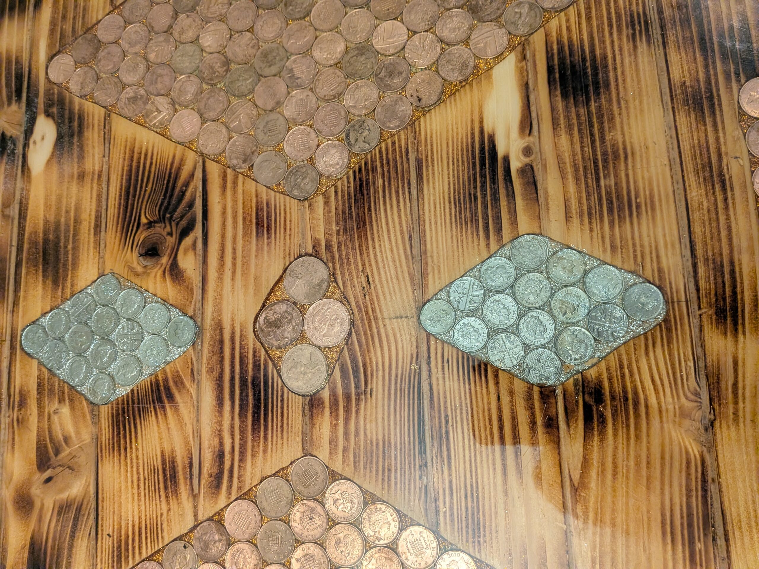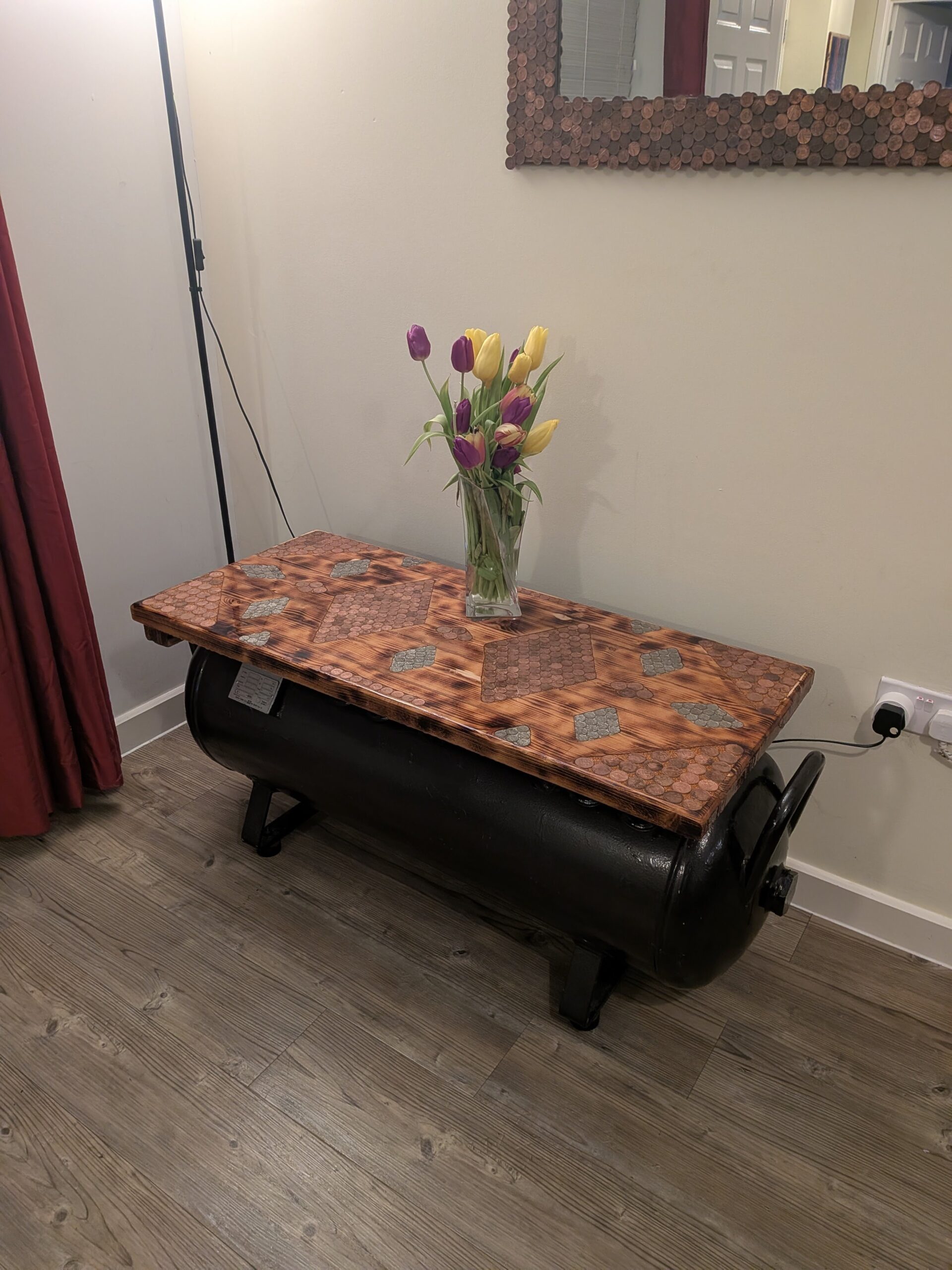 150L steel receiver tank, with 8 peices of burnt wood joined to make a surface. The coins are submerged into the face with some copper/silver glitter behind them, then covered with epoxy resin