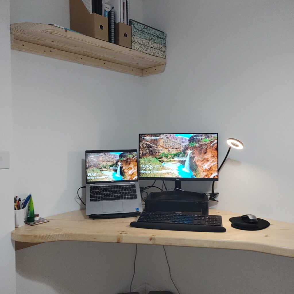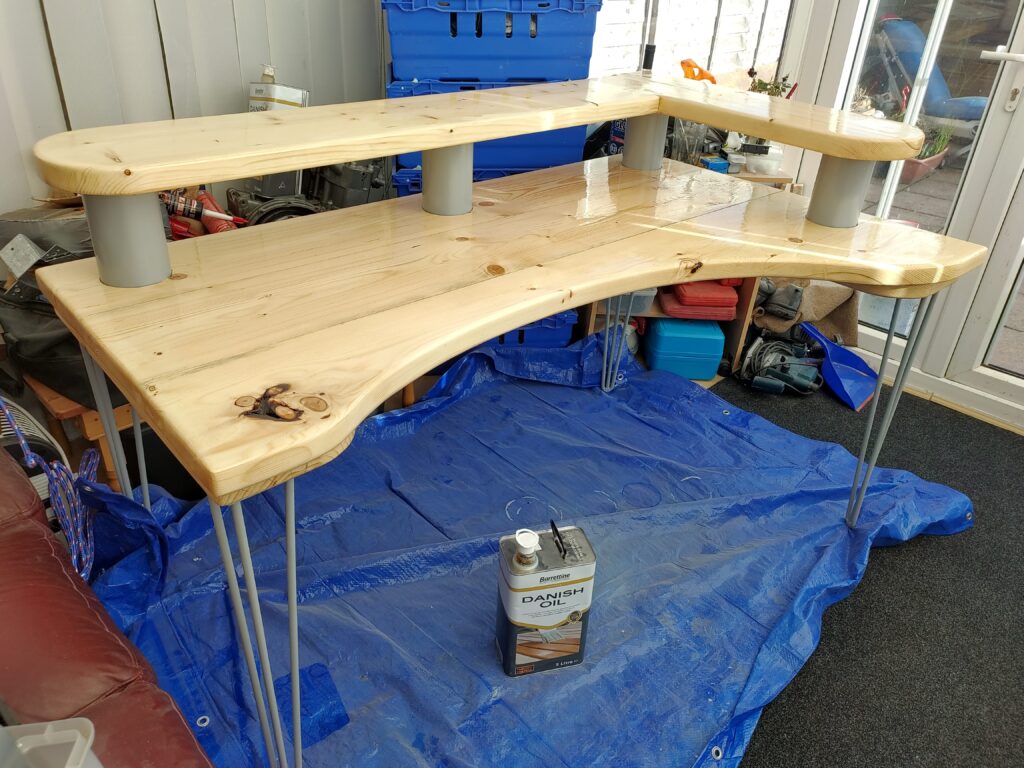 This picture was taking during the creation of my own desk as I wanted a multi level desk with some curves that would be able to take 2 monitors plus a laptop docking station. Admittedly, I wanted something that was “one of a kind” whilst also using mainly recycled materials.