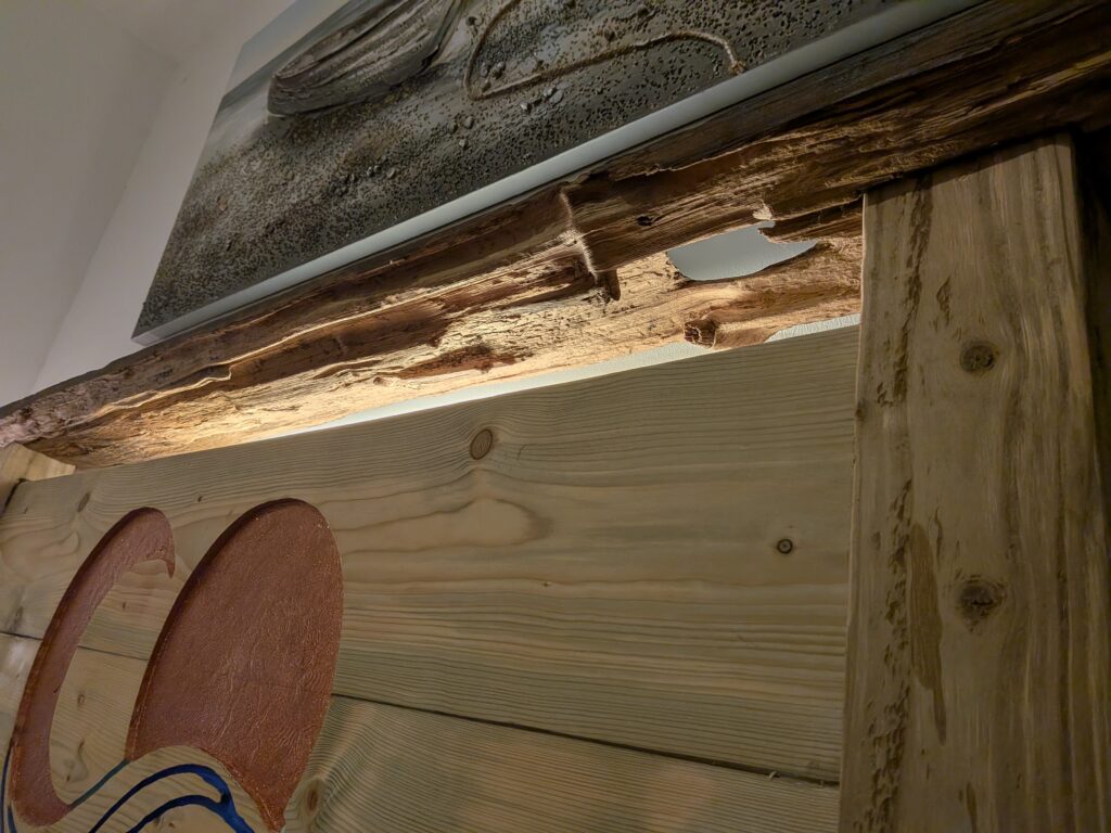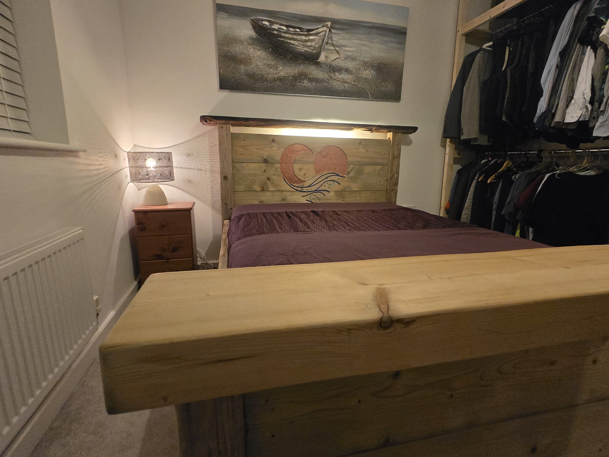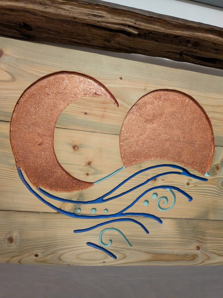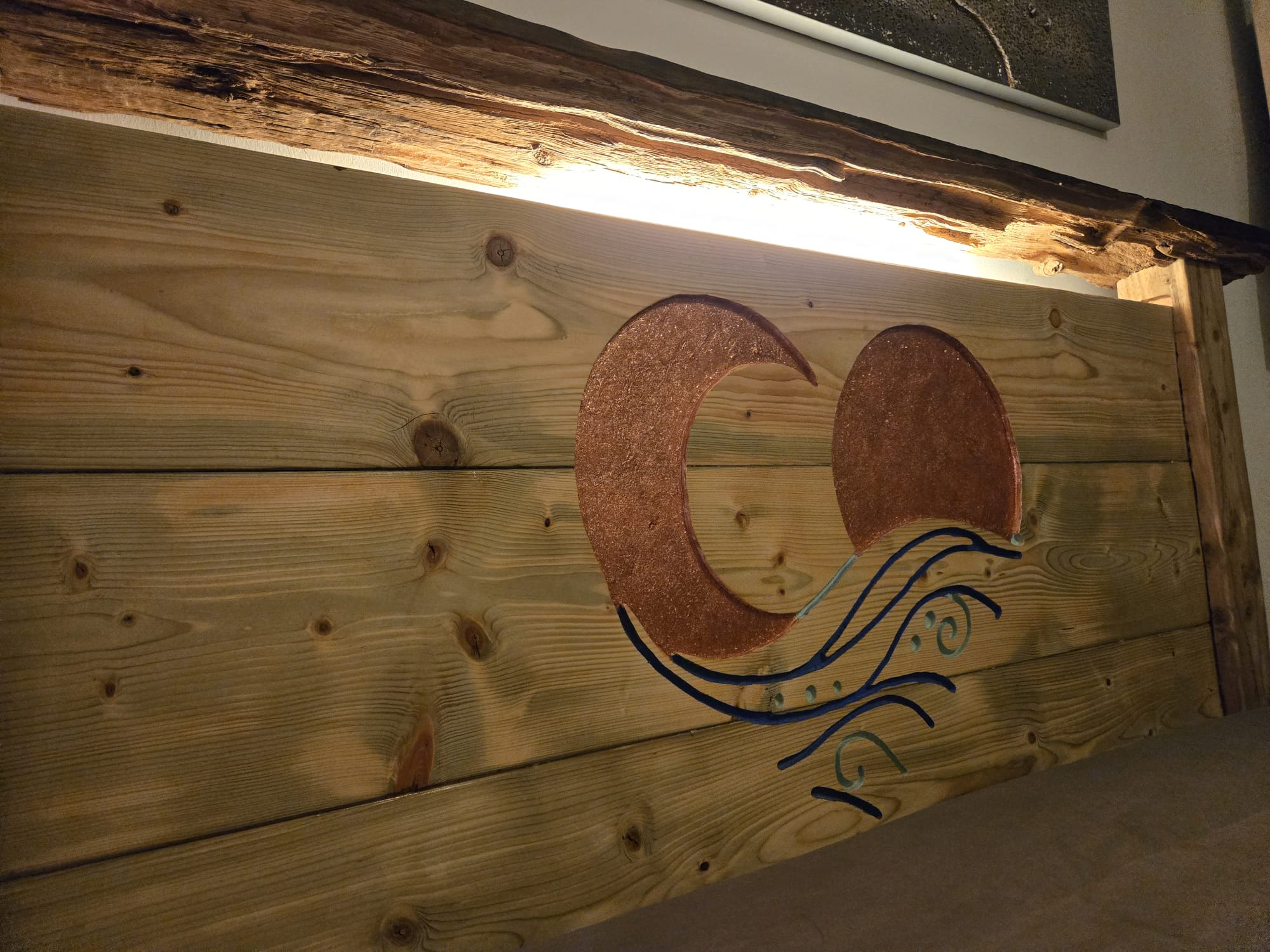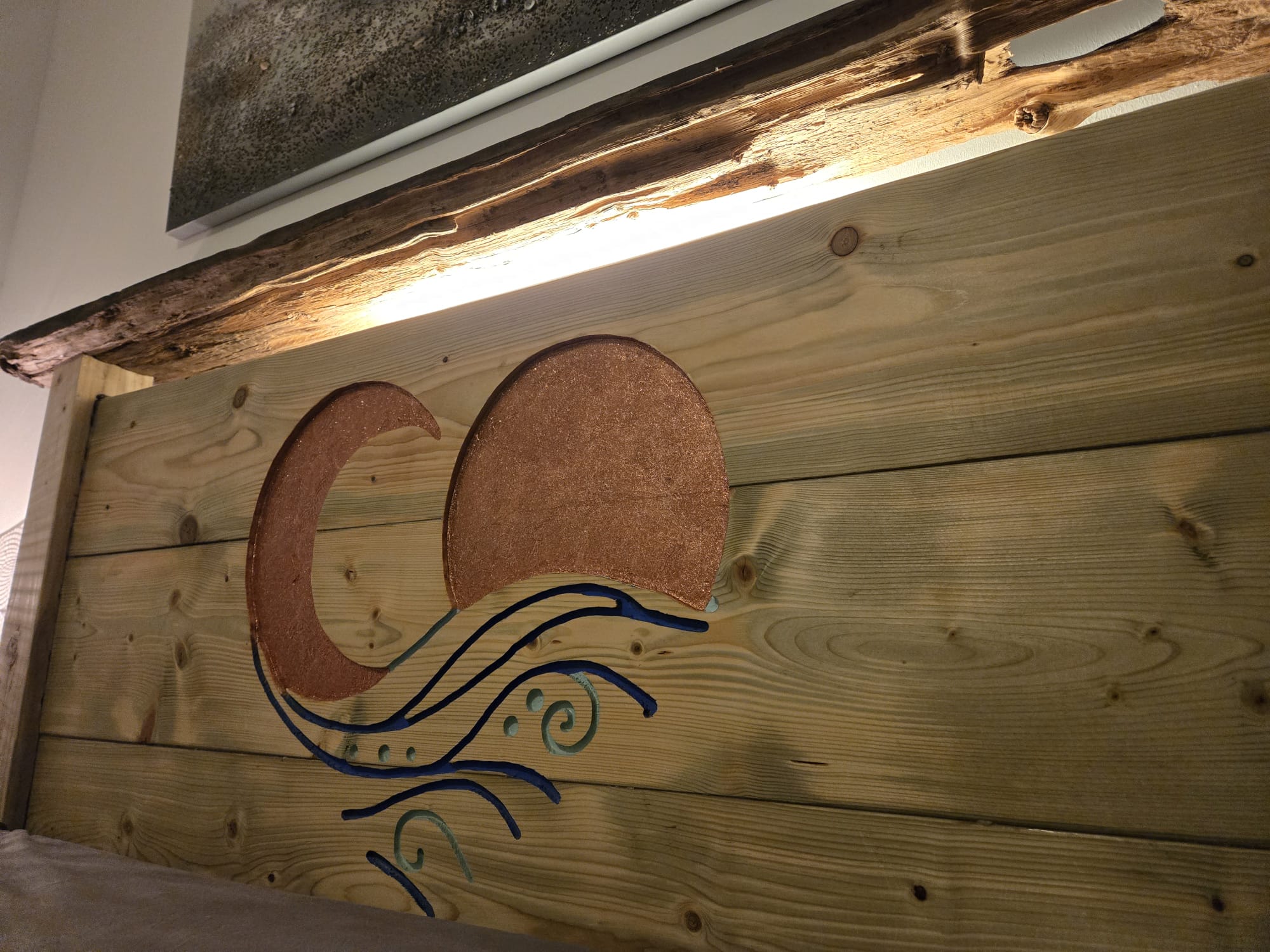 Both the sun and moon were painted with copper glitter paint which gives off this warm shimmer, and the backlight shows off the sea battered side of the diftwood.