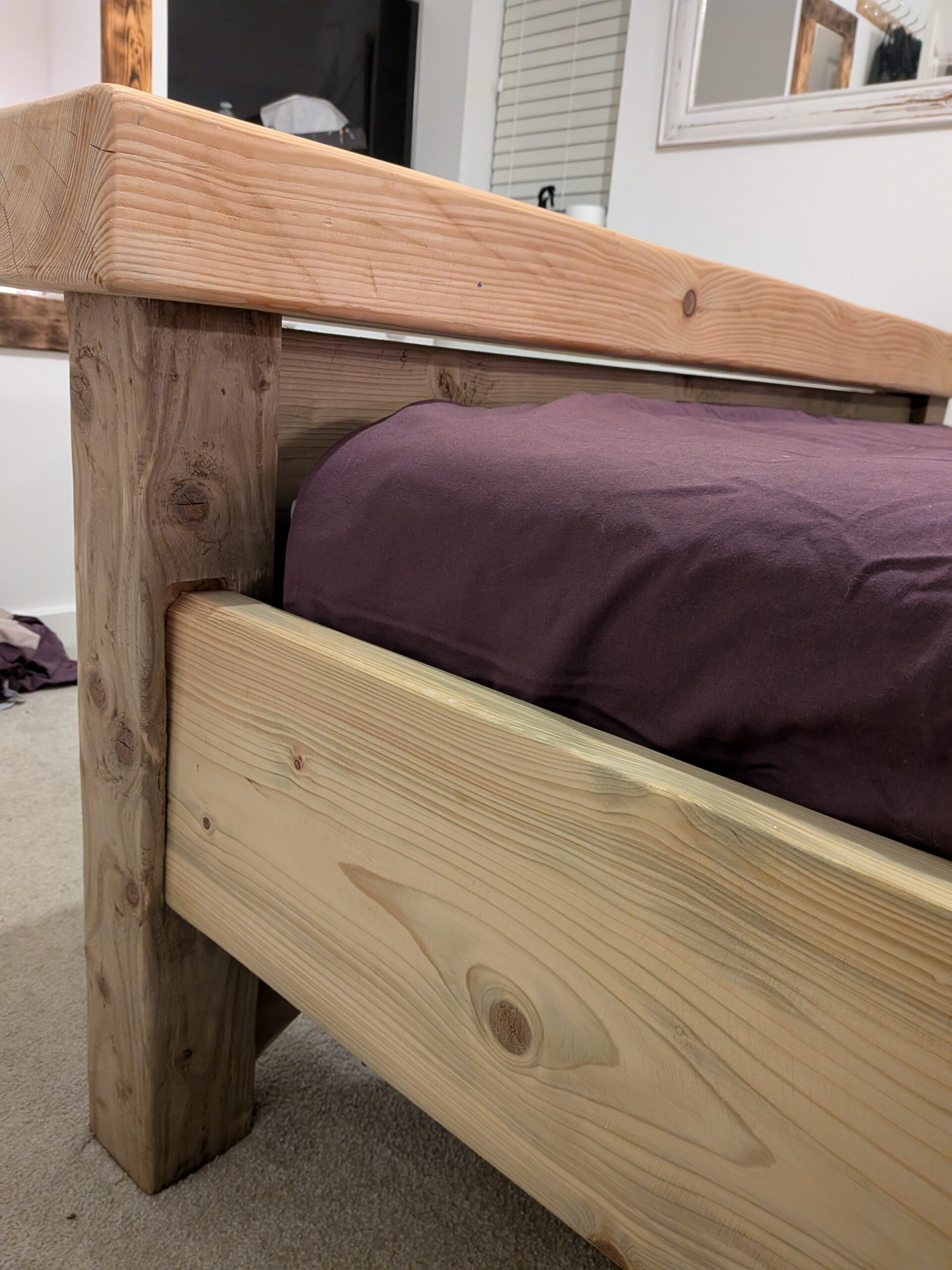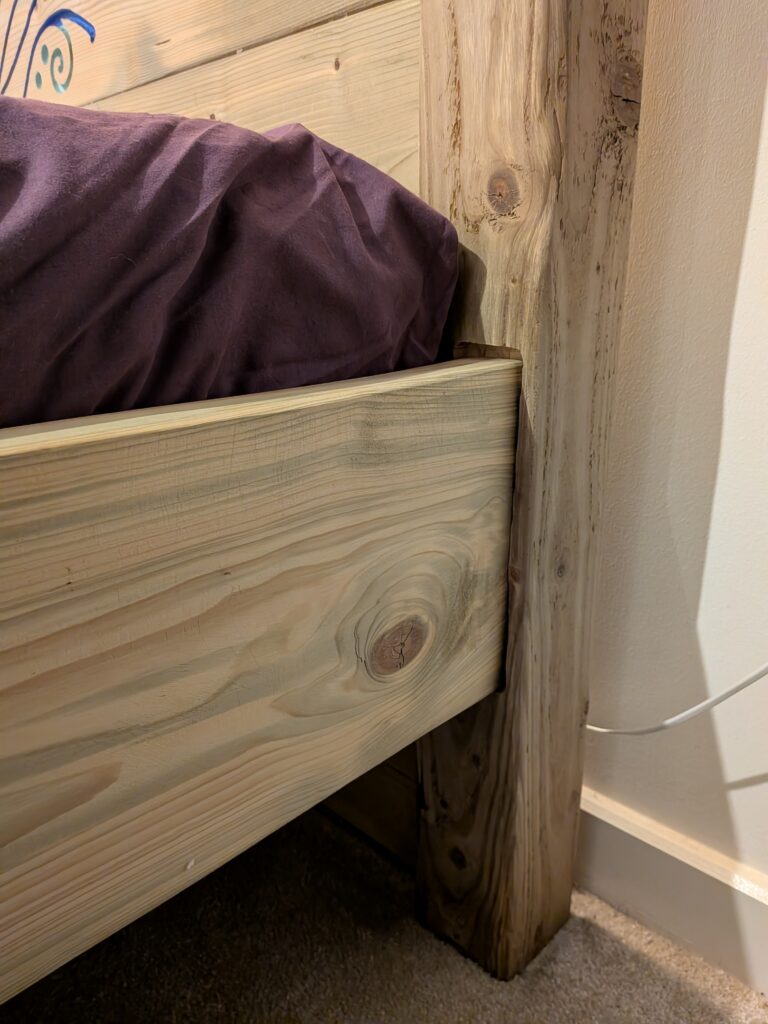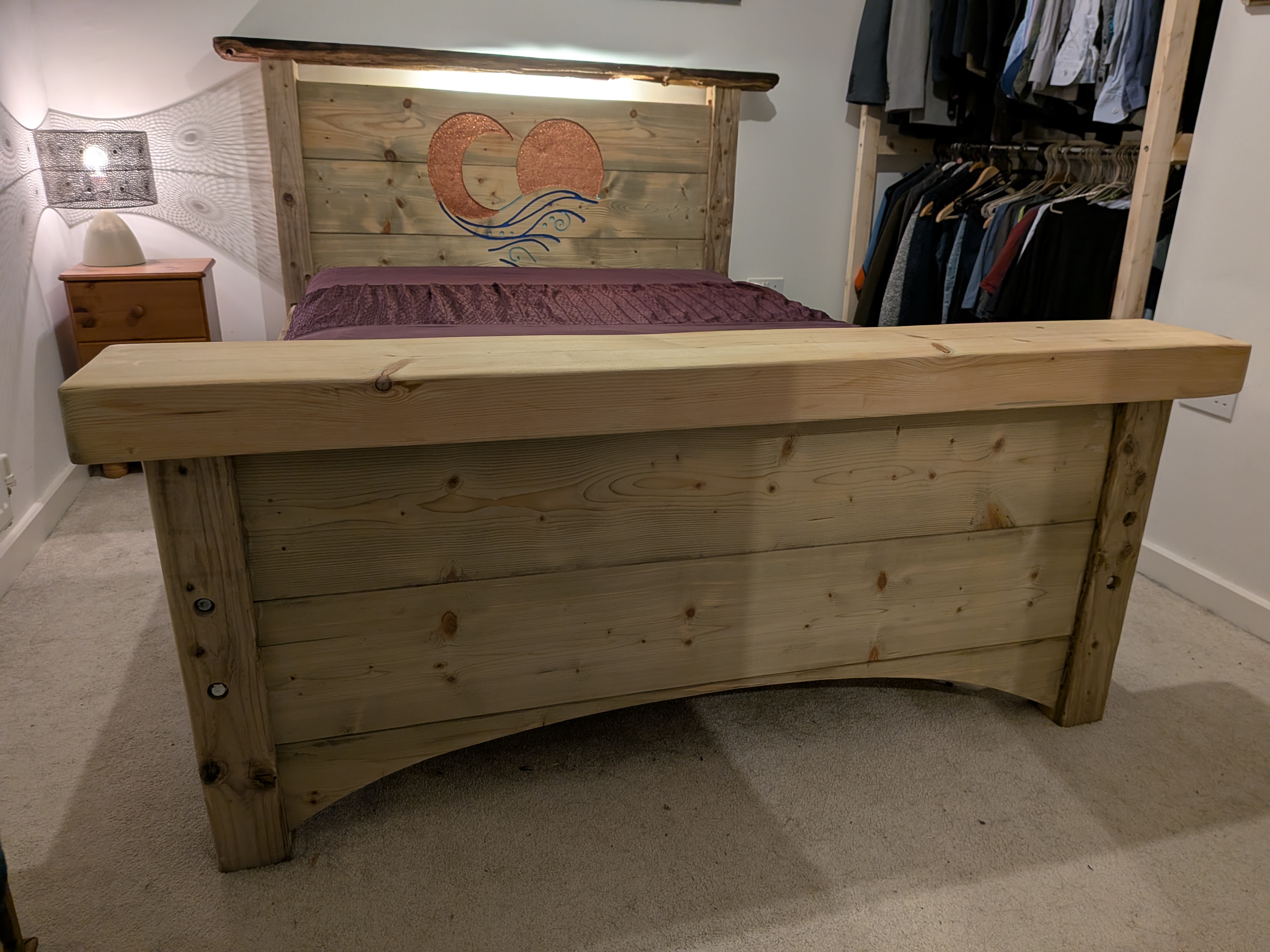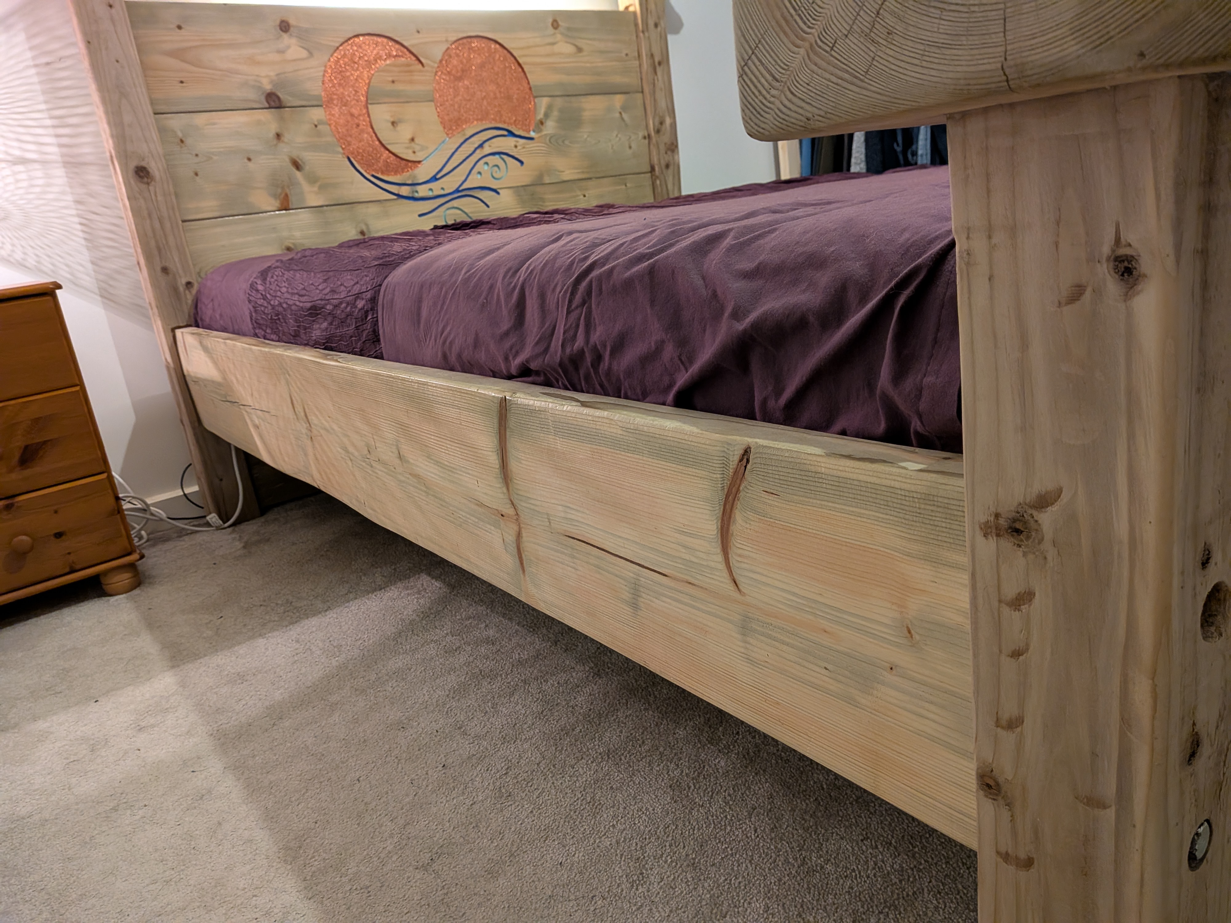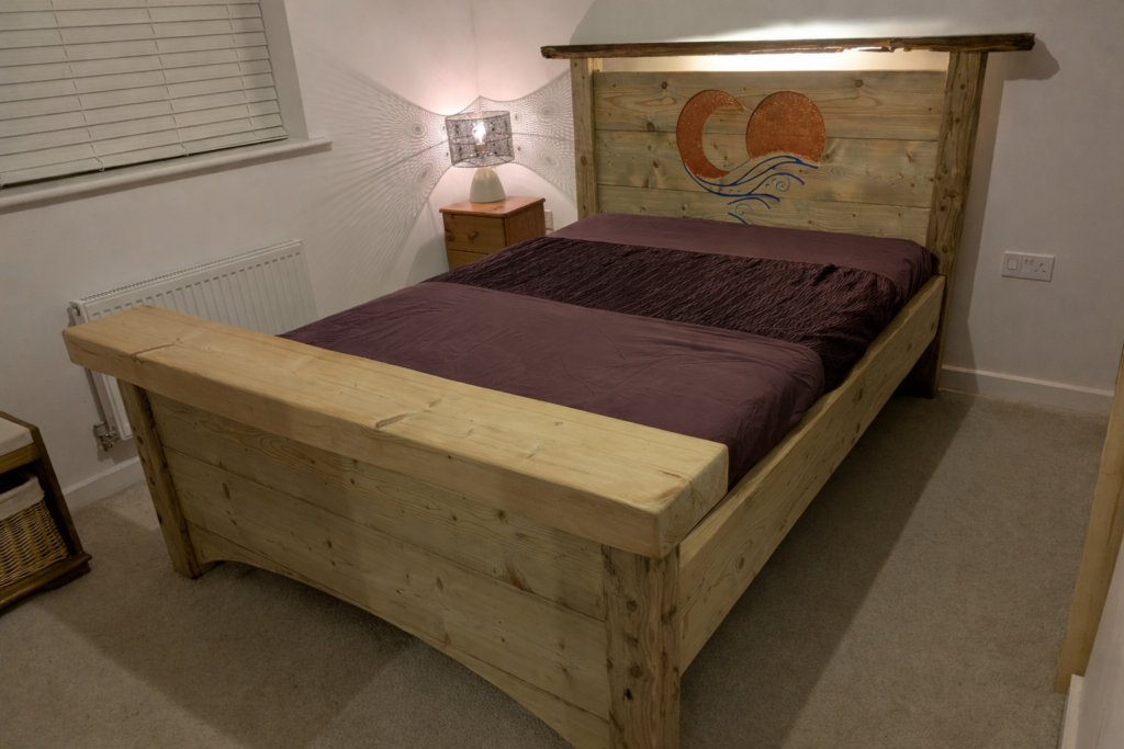 Built around the dimensions of a double mattress, I wanted to feel like being on a raft out on the water. So using reclaimed industrial timber, fence posts, the driftwood headboard and a sleeper on the footboard, I needed to come up with something great to engrave into it. I think this motif gave it the perfect spirit and character I wanted.